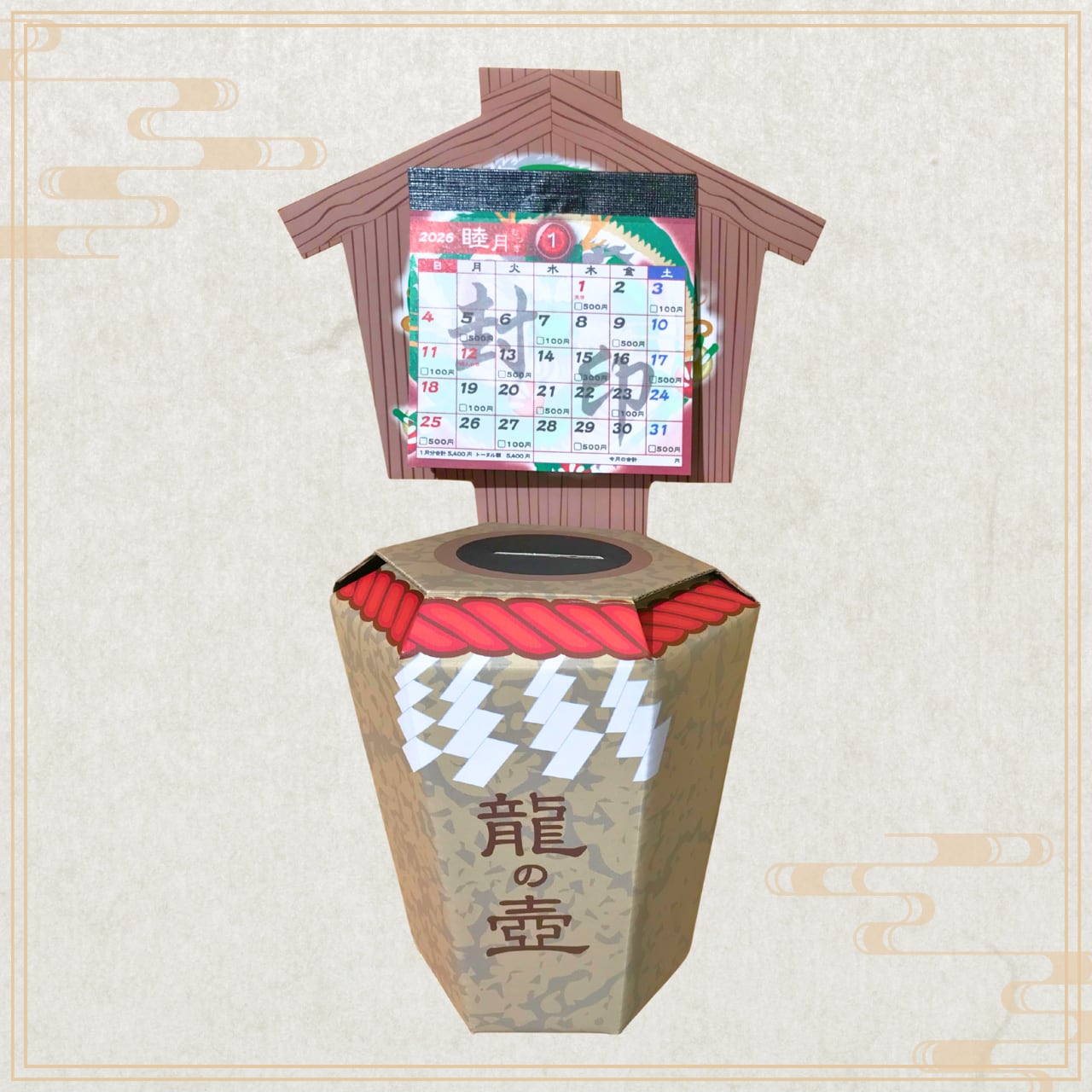 【貯金箱カレンダー入荷しました!!】 使用する硬貨は100円玉と500円玉(100円5枚でも) 1日おきに決められた金額100円〜500円を貯金して6万円を目指してください 月が終わるごとに龍の封印が徐々に解かれていき、1年後願いを叶える龍の封印を解けば あなたの願いが叶う予感…