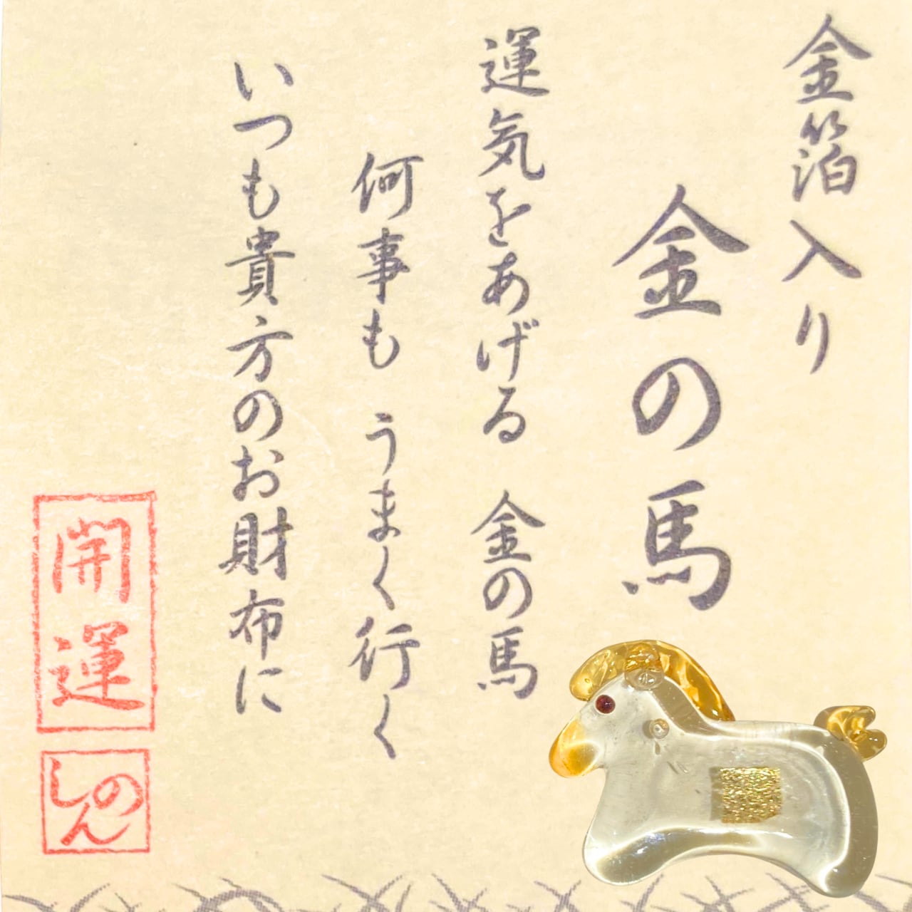【ガラス守り 午】 気高く美しい午を象ったガラス守りは、あなたの守護と幸運を象徴するお守りです。この特別なアイテムは、日常生活に魔法のようなエネルギーをもたらし、心の安らぎやポジティブなエネルギーを感じることができます。 透明感のあるガラスが、光を受けて輝き、その存在感を放つことで、持つ人の運気を高めるサポートをします。龍の力を身近に感じながら、あなたらしい毎日をお楽しみください。